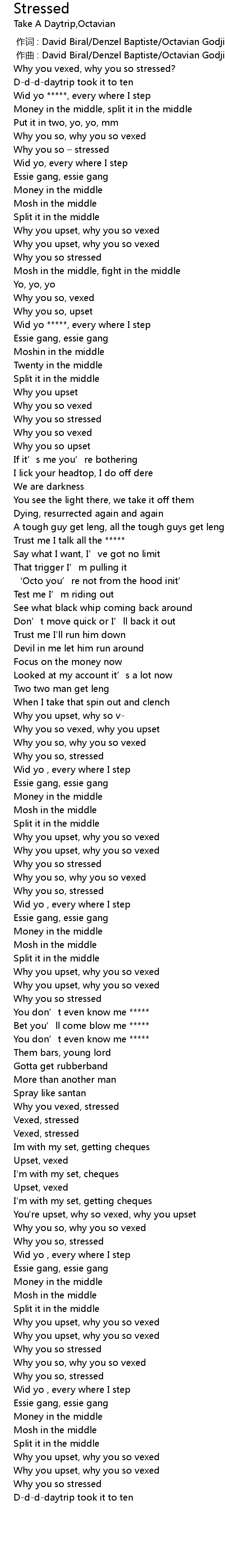 | [00:01.33] | Why you vexed, why you so stressed? |