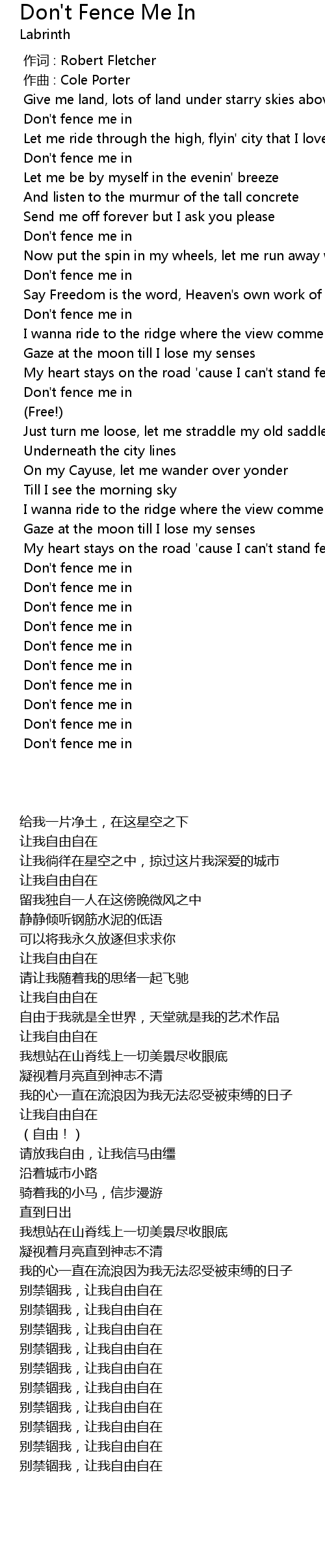 | [00:57.915] | My heart stays on the road ' cause I can' t stand fences |