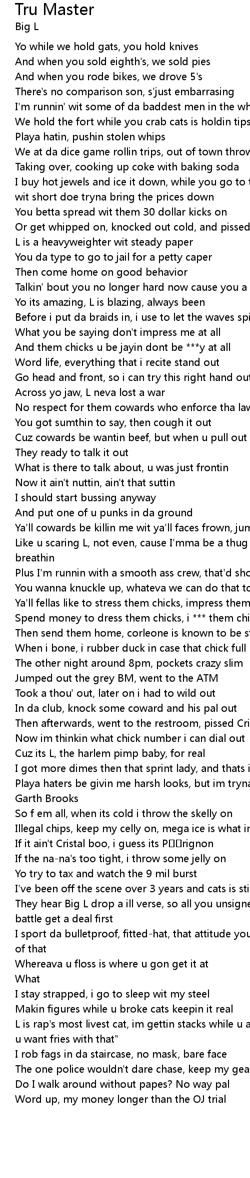 | [03:56.937] | They hear Big L drop a ill verse, so all you unsigned cats that wanna battle get a deal first |