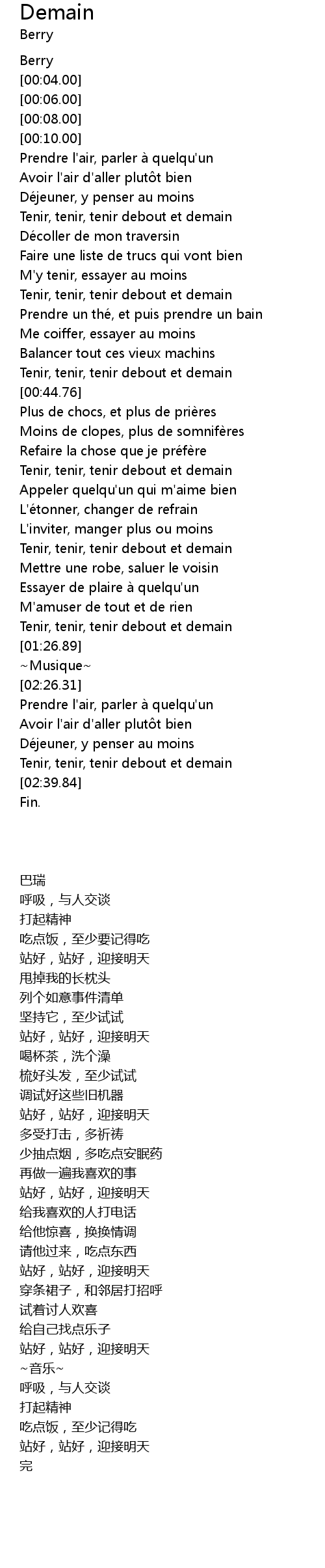 | [00:31.34] | Tenir, tenir, tenir debout et demain |