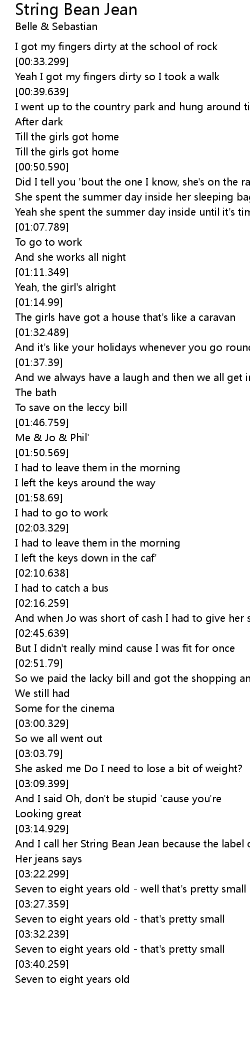 | [03:16.919] | And I call her String Bean Jean because the label on |