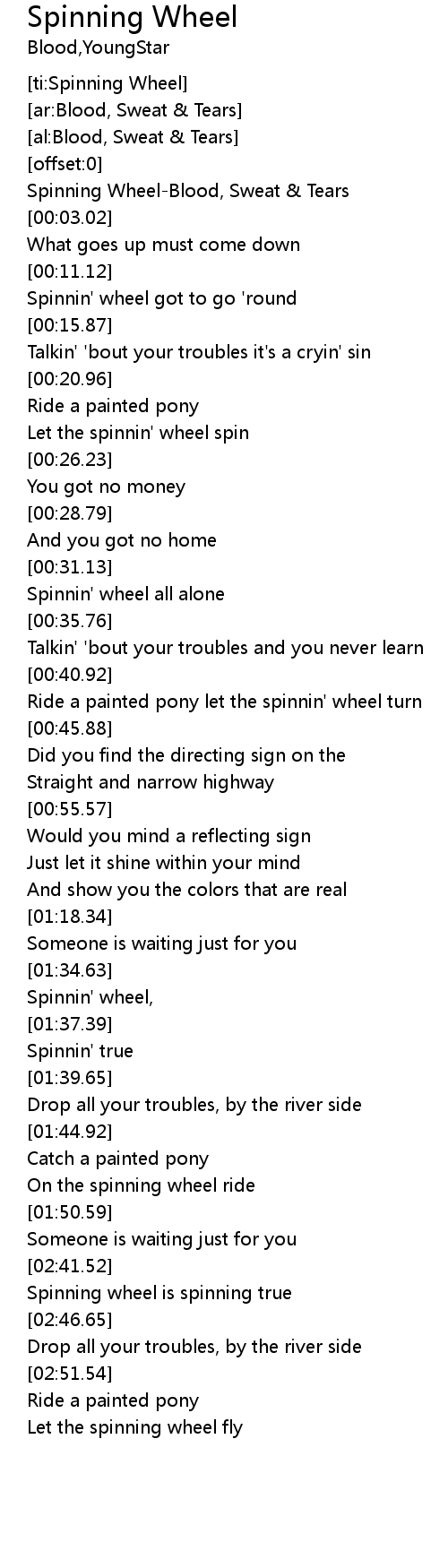 | [00:01.33] | Spinning Wheel-Blood, Sweat & Tears |
