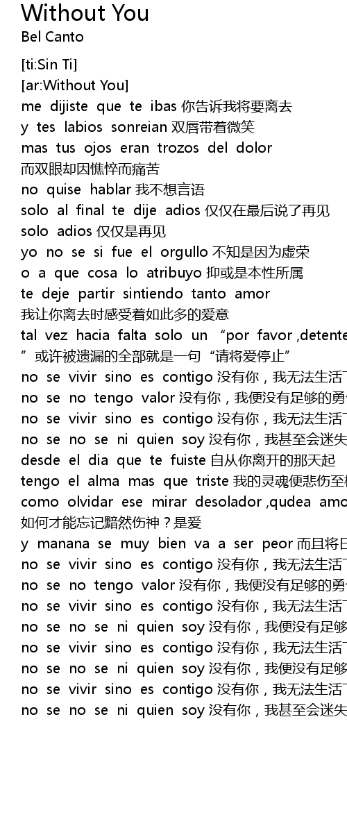 | [02:18.79] | no se vivir sino es contigo méi yǒu nǐ, wǒ wú fǎ shēng huó xià qù |