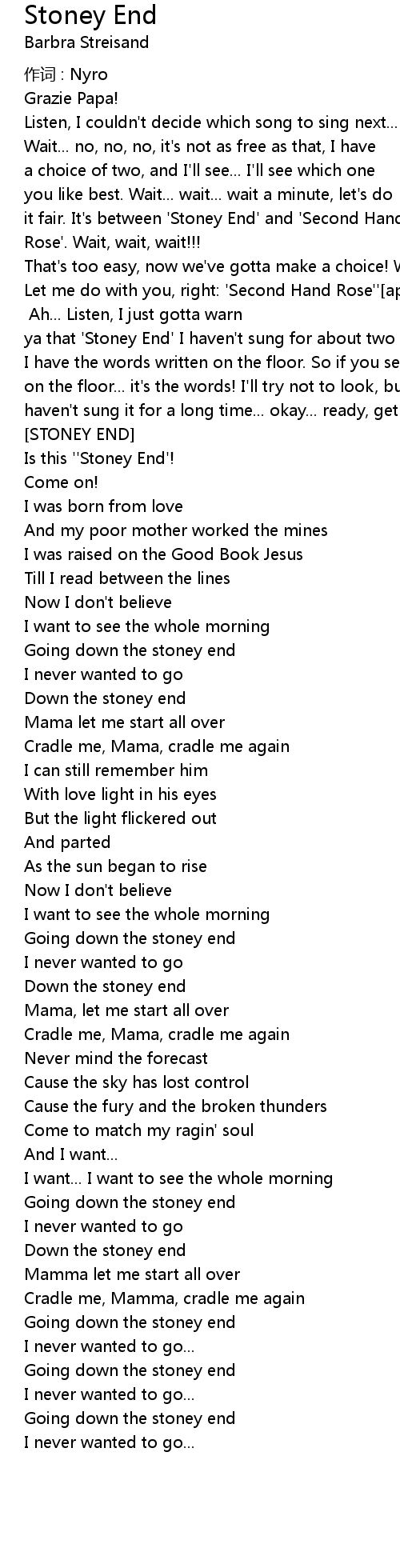 | ' Stoney End' more applause Ah... Listen, I just gotta warn | |