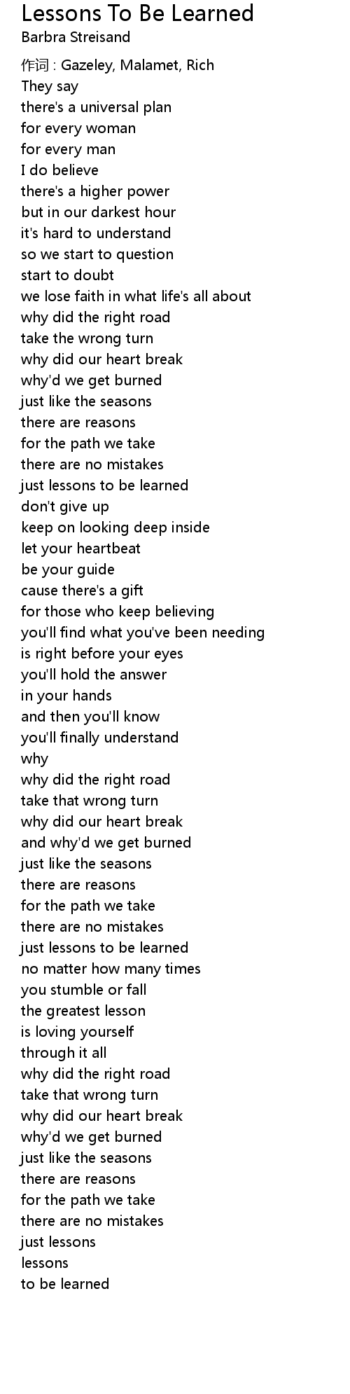 | Song | Lessons To Be Learned |