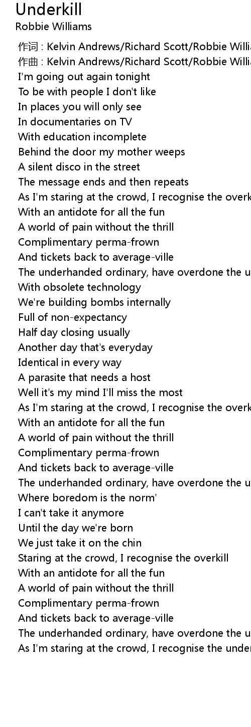 | [00:01.000] | zuò qǔ : Kelvin Andrews Richard Scott Robbie Williams Scott Ralph |