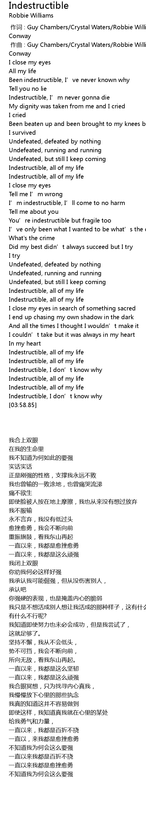 | [00:30.65] | Indestructible, I' m never gonna die |