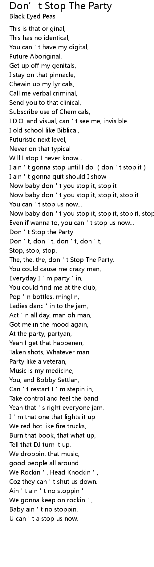 | [02:18.980] | The, the, the, don t Stop The Party. |