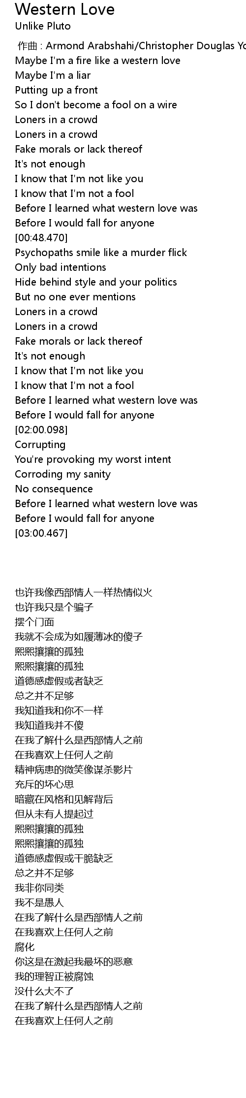 | [02:48.424] | Before I learned what western love was |