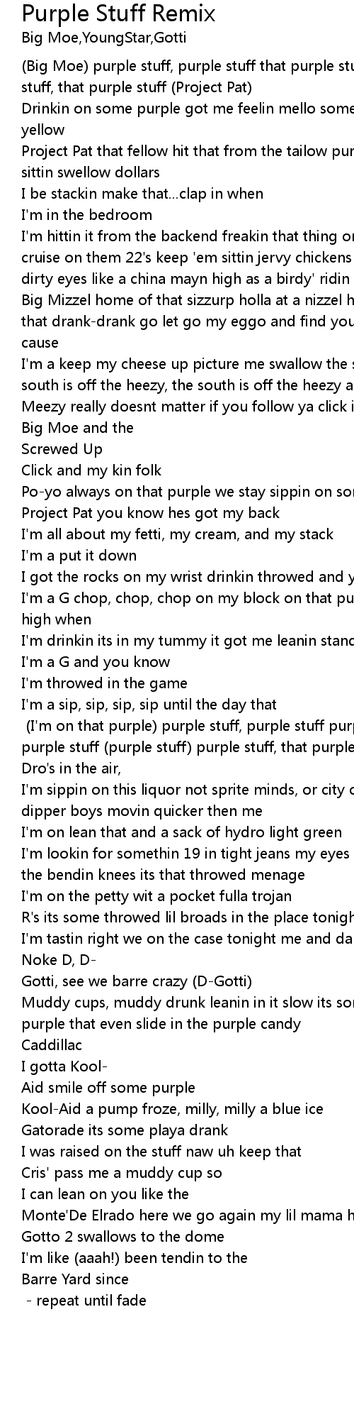 | (Big Moe) purple stuff, purple stuff that purple stuff, purple stuff purple stuff, that purple stuff (Project Pat) | |