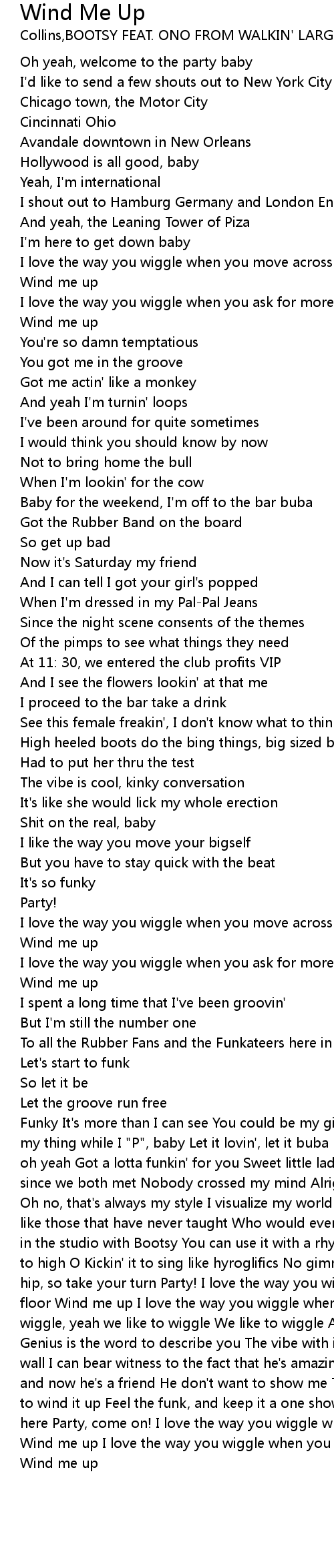 Funky It's more than I can see You could be my girl I could be a tree Oh, hold my thing while I "P", baby Let it lovin', let it buba Lookin' swell, oh brother, oh yeah Got a lotta funkin' for you Sweet little lady of mine It's been a while since we both met Nobody crossed my mind Alright But sugar baby open up my file Oh no, that's always my style I visualize my world like raw I throw lyrics up like those that have never taught Who would ever thought that someday I would be in the studio with Bootsy You can use it with a rhymes for a rhyme From the bad to high O Kickin' it to sing like hyroglifics No gimmicks Funk hot, keep you hip, so take your turn Party! I love the way you wiggle when you move across the floor Wind me up I love the way you wiggle when you ask for more We like to wiggle, yeah we like to wiggle We like to wiggle And funk it in your thing Genius is the word to describe you The vibe with it And now I've seen it on the wall I can bear witness to the fact that he's amazing He had cool conversation, and now he's a friend He don't want to show me That to get the job down you need to wind it up Feel the funk, and keep it a one show There's a party goin' on here Party, come on! I love the way you wiggle when you move across the floor Wind me up I love the way you wiggle when you ask for more We like to wiggle Wind me up |