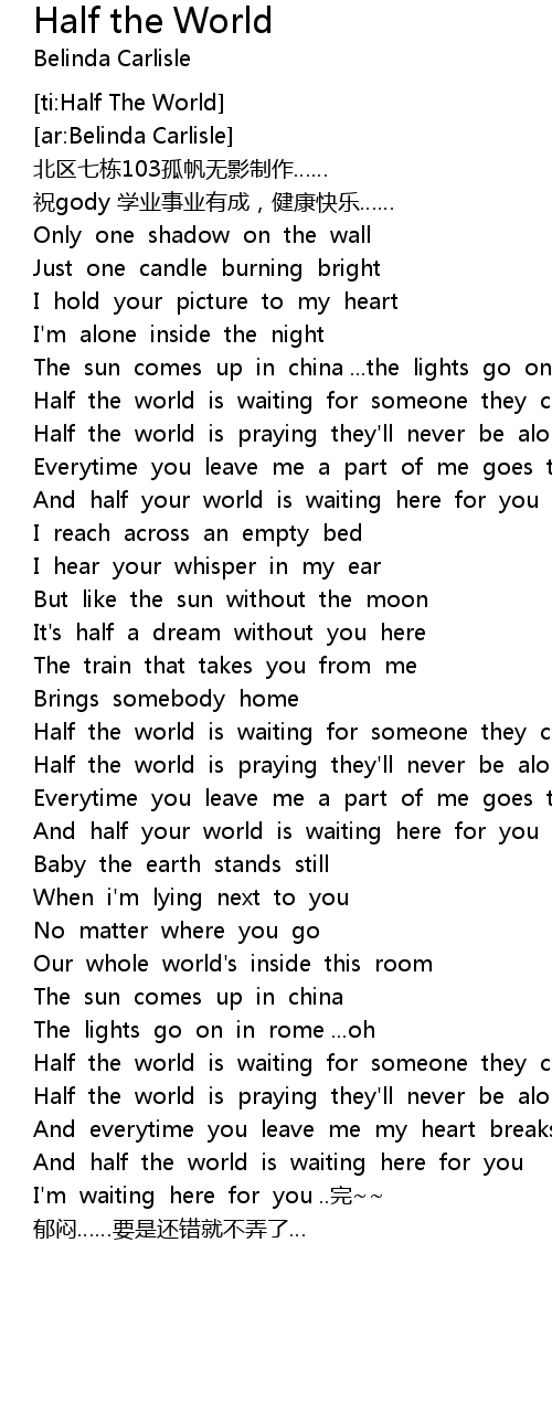 | [00:53.06] | Half the world is praying they' ll never be alone |