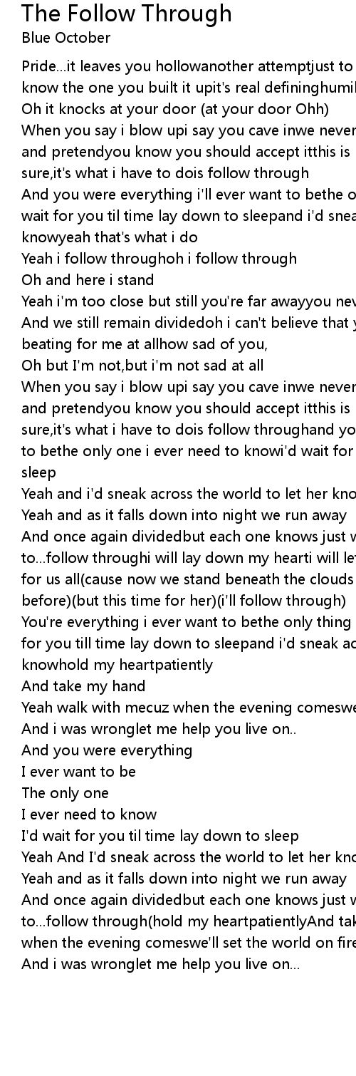And once again dividedbut each one knows just what we have to dowe dowe have to...follow throughi will lay down my hearti will let you gothat's what's best for us all(cause now we stand beneath the clouds and God above)(like we did before)(but this time for her)(i'll follow through) |