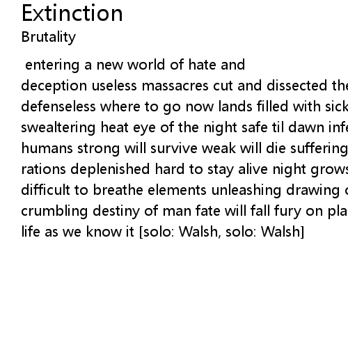 [music by Acres/Walsh, lyrics by Reigel/Coker] entering a new world of hate and deception useless massacres cut and dissected there is no law all are defenseless where to go now lands filled with sickness blinding brightness swealtering heat eye of the night safe til dawn infertile earth ruins from humans strong will survive weak will die suffering must take cover light is near rations deplenished hard to stay alive night grows shorter dread of the future difficult to breathe elements unleashing drawing closer to the sun world is crumbling destiny of man fate will fall fury on planet civilization swallowed no life as we know it [solo: Walsh, solo: Walsh] |