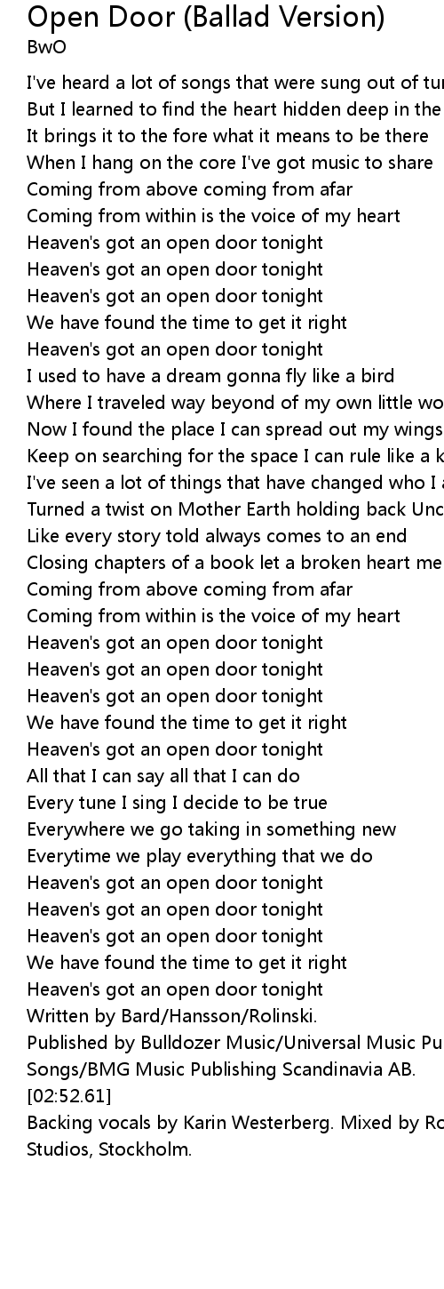 Published by Bulldozer Music/Universal Music Publishing AB/Saphary Songs/BMG Music Publishing Scandinavia AB. |