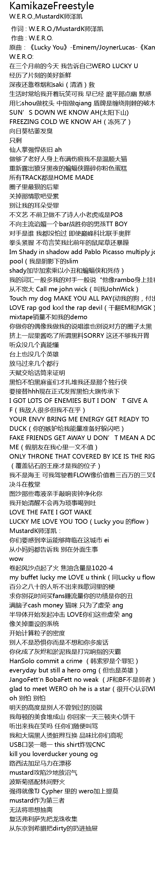 | [00:06.197] | 原曲:《Lucky You》-Eminem/JoynerLucas-《Kamikaze》 |