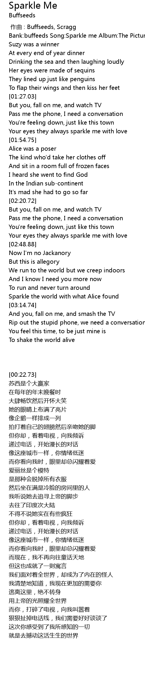 | [00:22.73] | Bank: buffeeds Song: Sparkle me Album: The Picture Show Lyrics: fanyixuan |