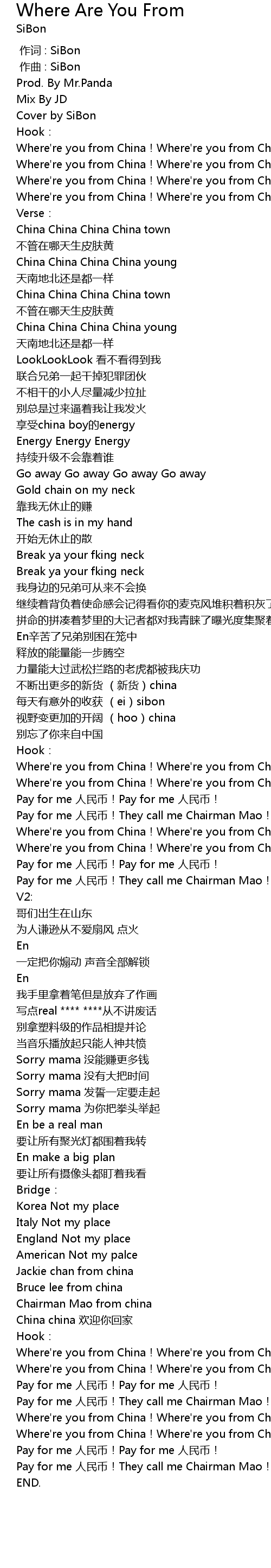 | [01:55.10] | Where' re you from China! Where' re you from China! |