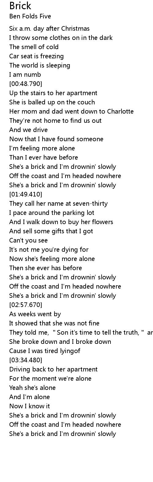 | [02:41.910] | She's a brick and I'm drownin' slowly |