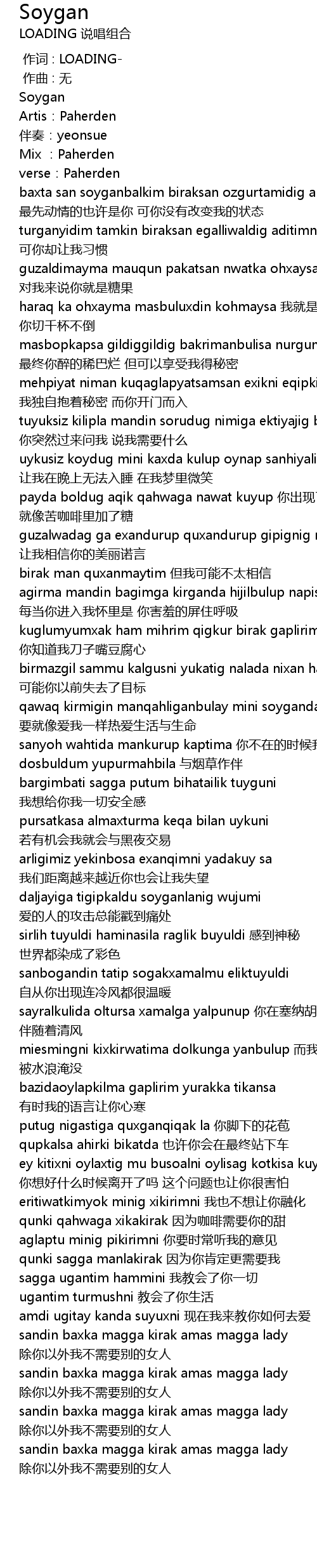 | [02:20.096] | sandin baxka magga kirak amas magga lady chu ni yi wai wo bu xu yao bie de nv ren |