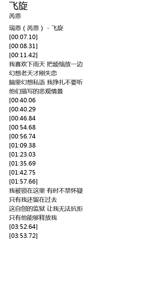 | [00:01.12] | 瑞恩(芮恩) - 飞旋 |