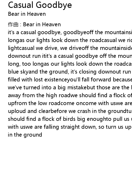 | it' s a casual goodbye, goodbyeoff the mountainsideseen but not for long, too longas our lights look down the roadcasual we ride, we rideto the mid day lightcasual we drive, we driveoff the mountainsideand the ground, it' s closing downout run itit' s a casual goodbye off the mountainsideseen but not for too long, too longas our lights look down the roadcasual we ride through the big blue skyand the ground, it' s closing downout run itout run itout in our place filled with lost existenceyou' ll fall forward because... oh no, my friendsi think we' ve turned into a big mistakebut those are the breaksfor having funturning away from the high roadwe should find a flock of birds big enoughto pull us upfrom the low roadcome oncome with uswe are falling straight down, so turn us uploud and clearbefore we crash in the groundturning away from the high roadwe should find a flock of birds big enoughto pull us upfrom the low roadcome oncome with uswe are falling straight down, so turn us uploud and clearbefore we crash in the ground |