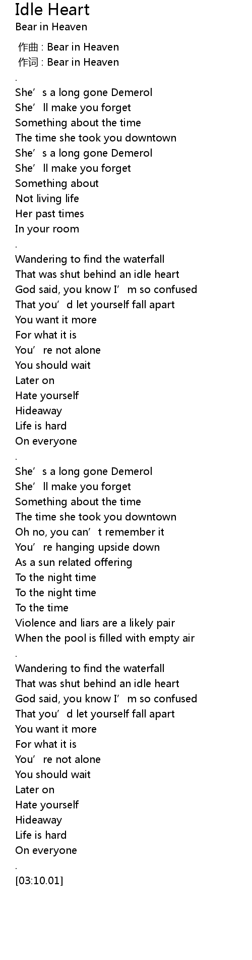 | [00:00.00] | 作曲 : Bear in Heaven |