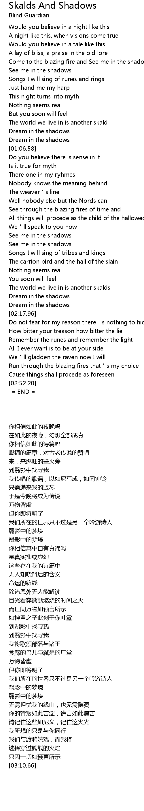 | [00:33.39] | Come to the blazing fire and See me in the shadows |