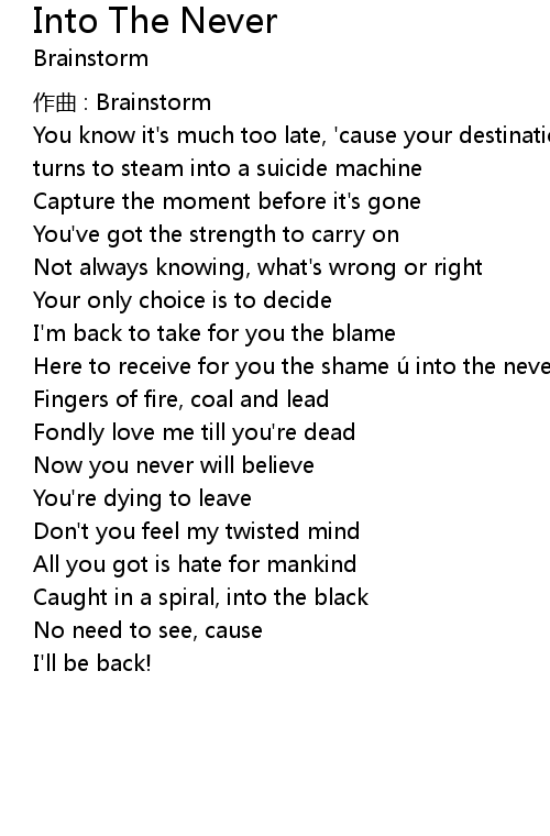 | You know it' s much too late, ' cause your destination ends ahead where the water turns to steam into a suicide machine | |