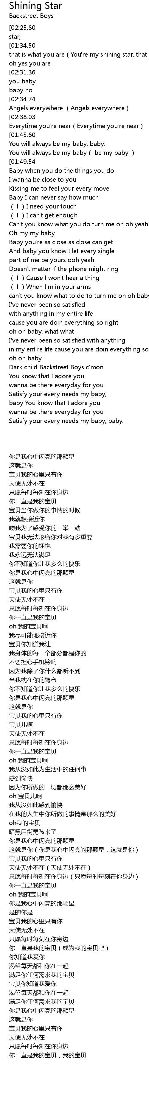 | [03:01.90][02:25.80][02:07.71][01:30.90][00:45.38][00:00.00] | You're my shining star, |