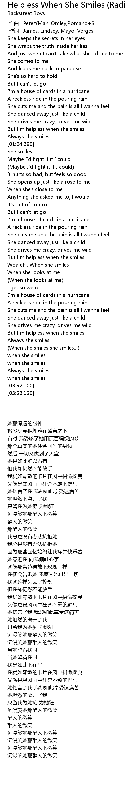 | [02:33.100] | But I' m helpless when she smiles |