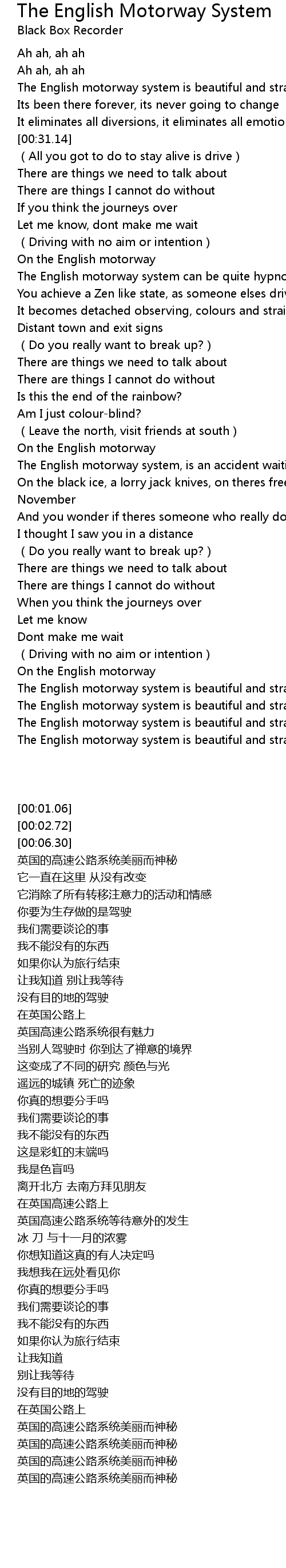 | [00:13.50] | The English motorway system is beautiful and strange |