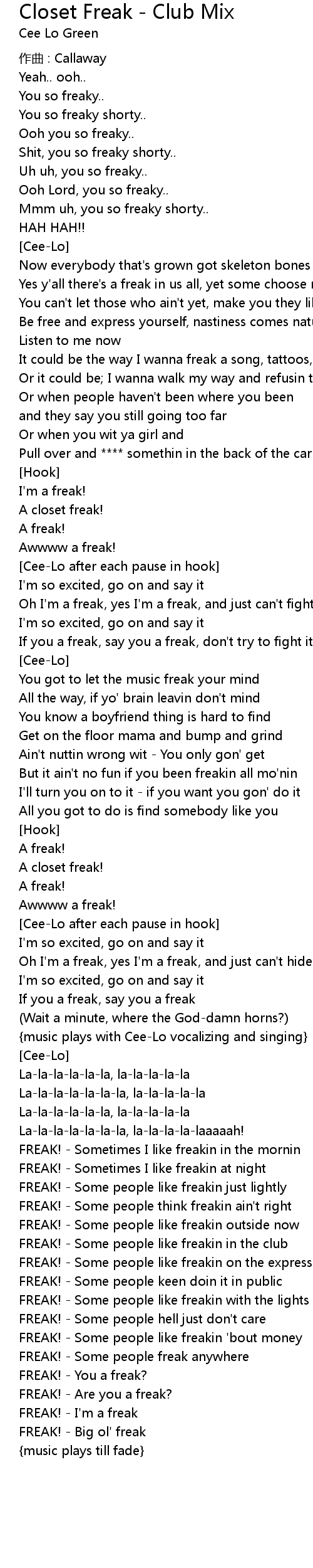 | Oh I'm a freak, yes I'm a freak, and just can't hide it | |