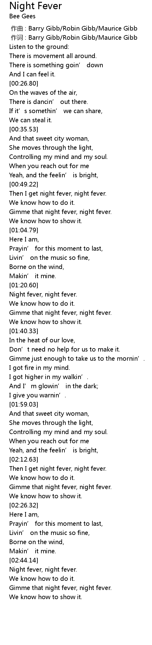 | [02:57.35] | Gimme that night fever, night fever. |