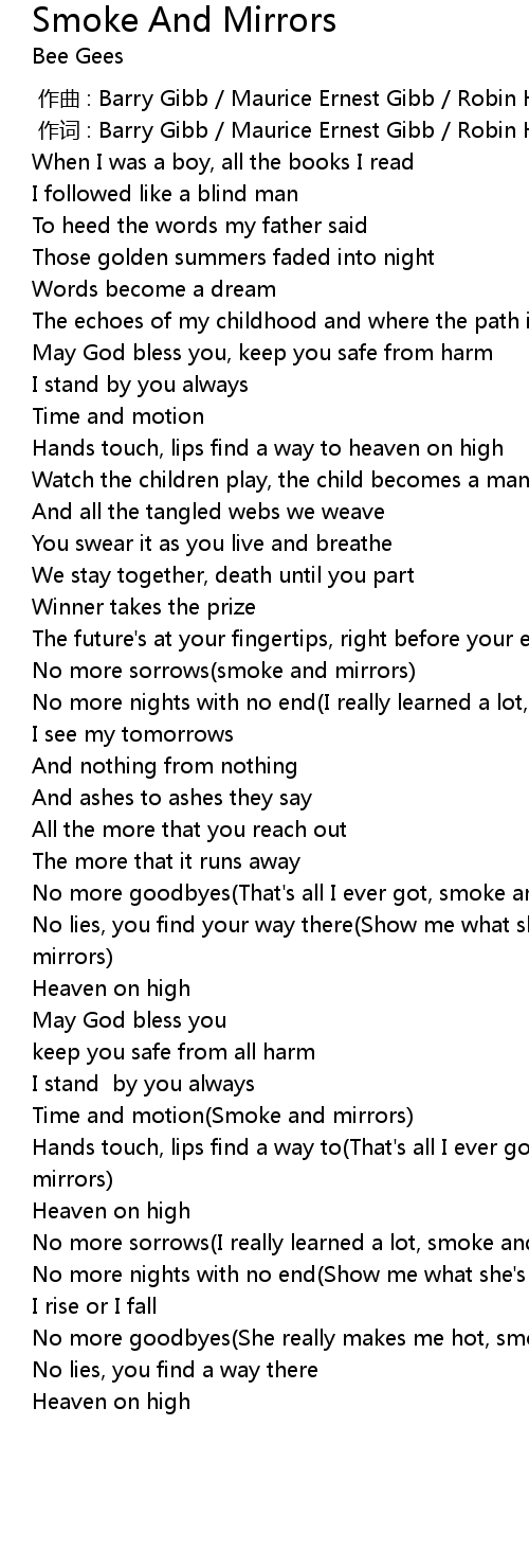 | [03:53.37] | Hands touch, lips find a way to That' s all I ever got, smoke and mirrors |