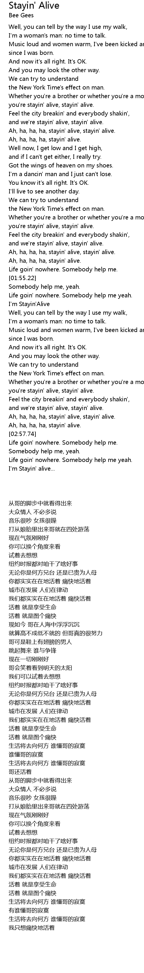 Ah, ha, ha, ha, stayin' alive, stayin' alive. |