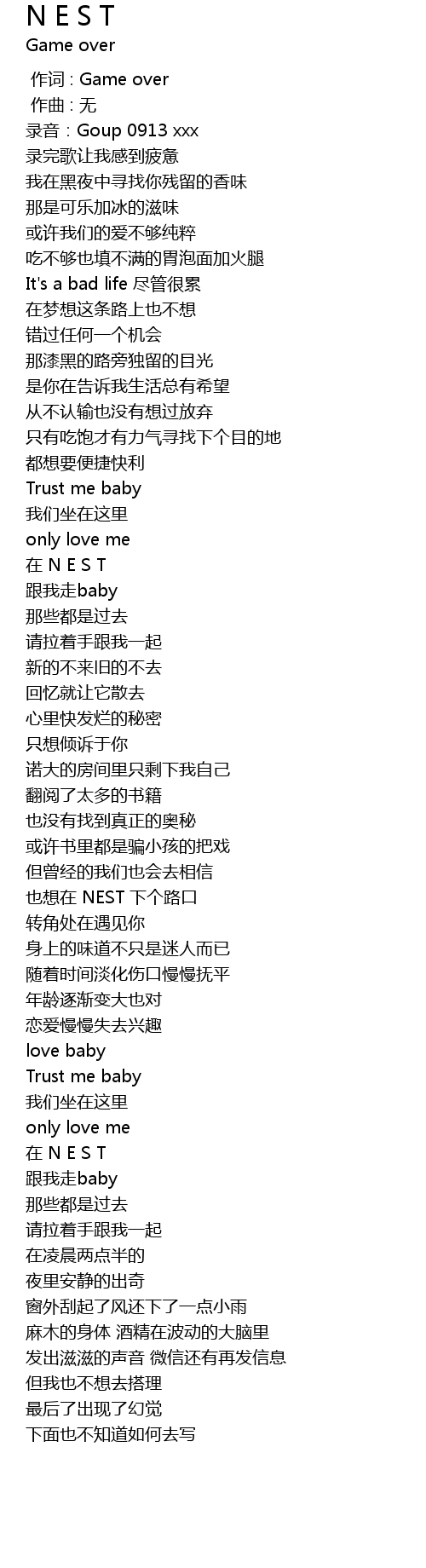 | [01:43.940] | yě xiǎng zài NEST xià gè lù kǒu |