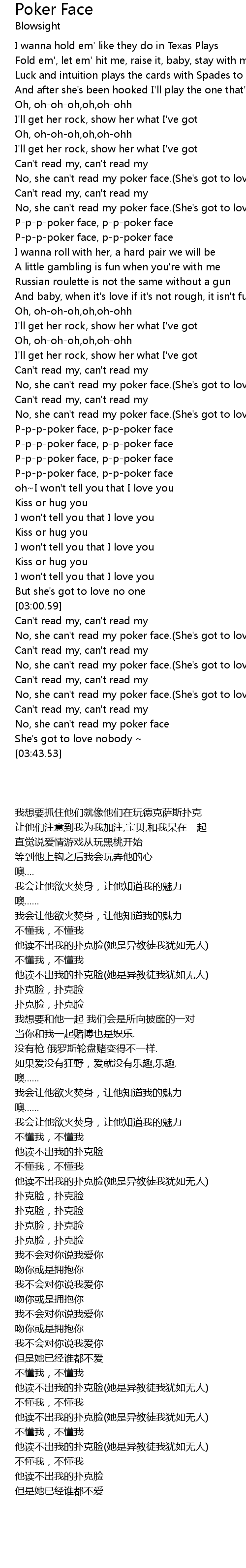 No, she can't read my poker face.(She's got to love nobody) |