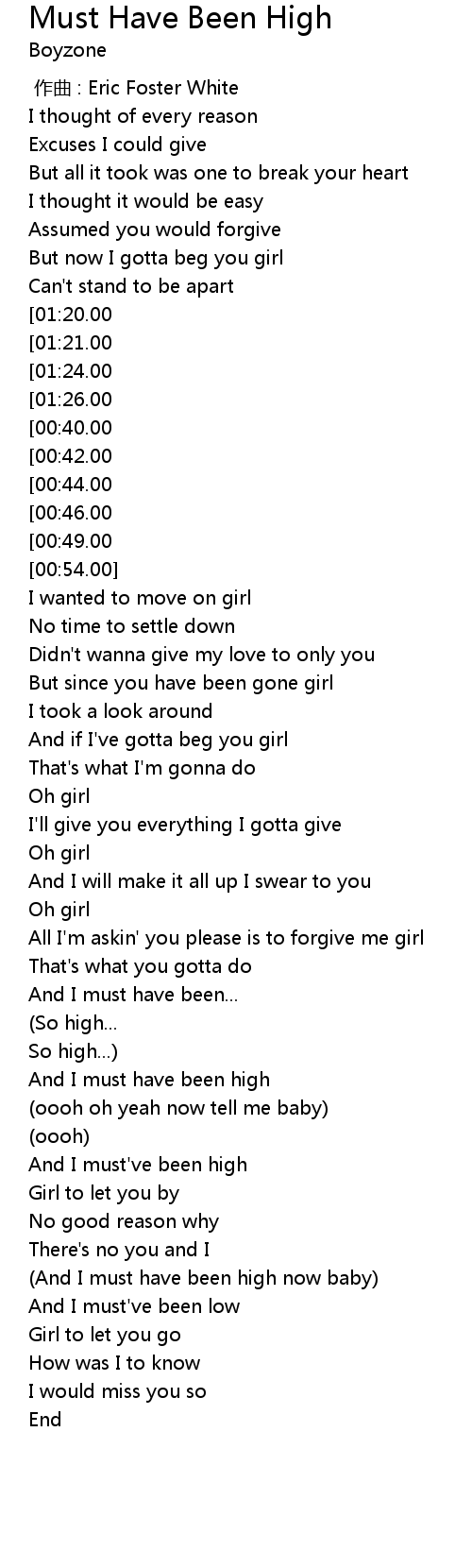 | [03:00.00][01:20.00][00:30.00] | And I must' ve been high |