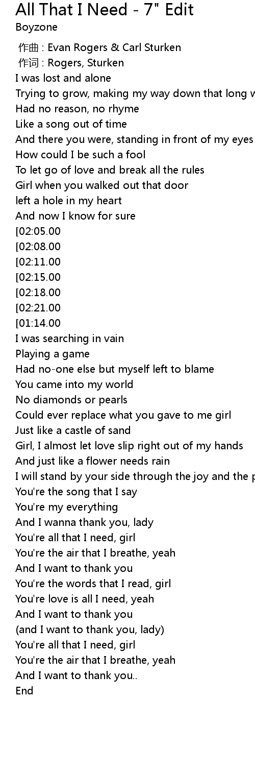 | [02:39.00][02:08.00][00:55.00] | Girl you're all that I need |