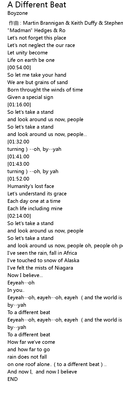 | [02:38.00][01:41.00] | To a different beat |