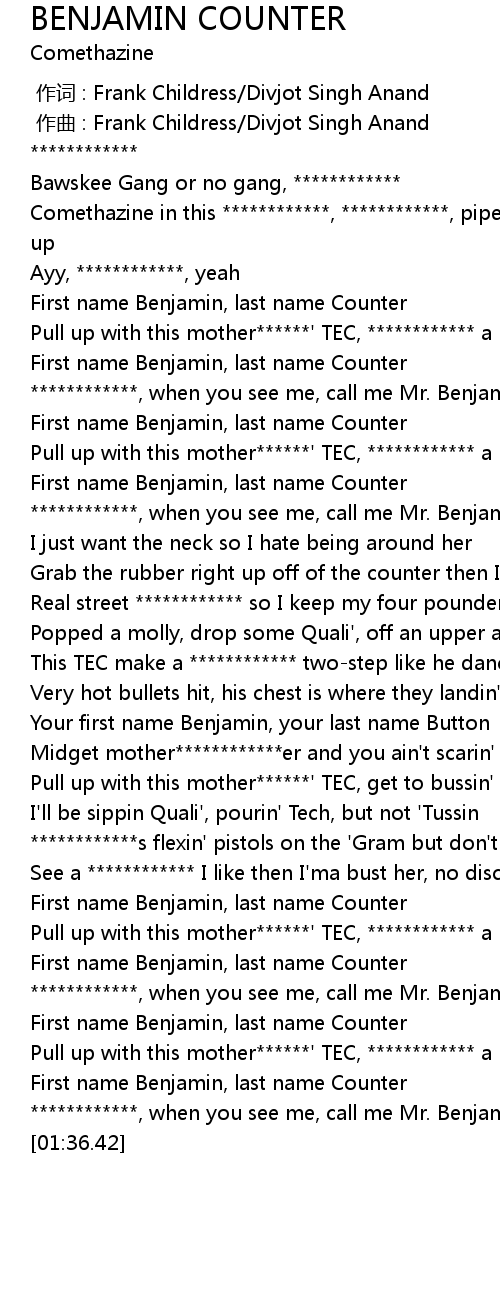 | [01:33.17] | ************, when you see me, call me Mr. Benjamin Counter |