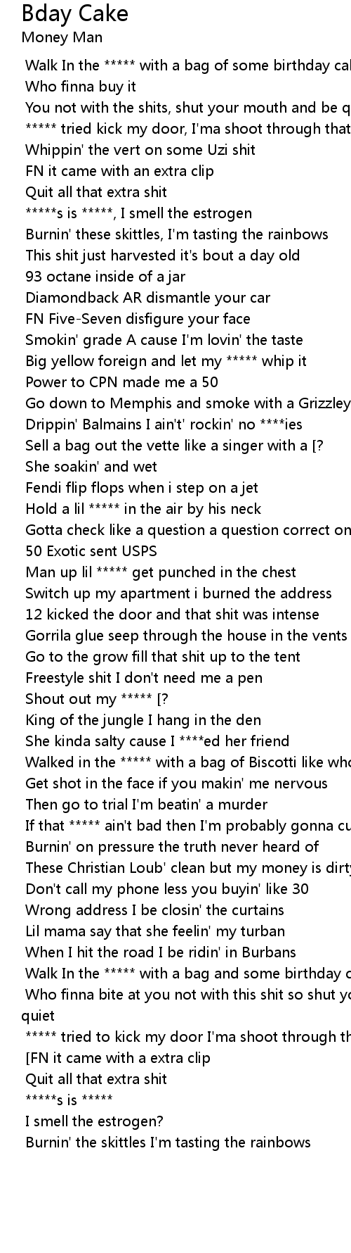 | [00:00.980] | Walk In the ***** with a bag of some birthday cake |