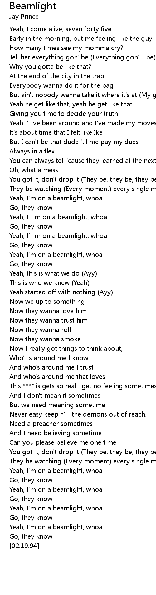 | [00:50.48] | Yeah, I' m on a beamlight, whoa |