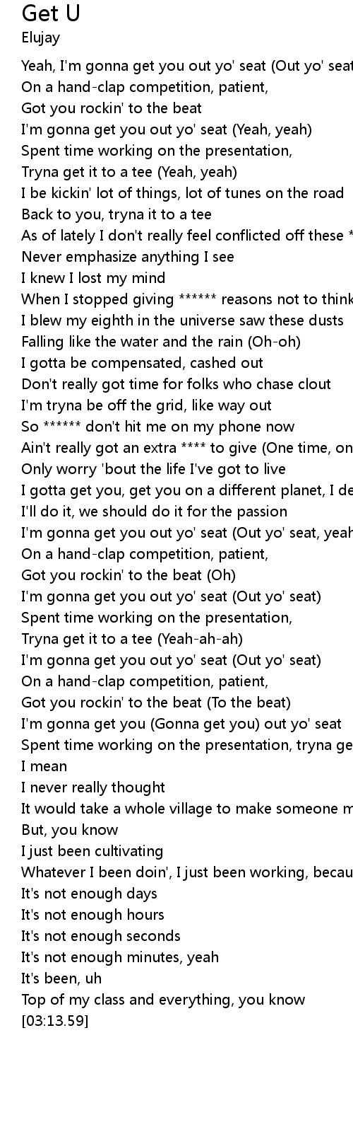 | [01:27.23] | I'm gonna get you out yo' seat (Out yo' seat, yeah, yeah) |