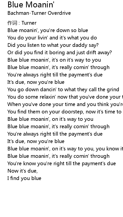 | Blue blue moanin', on it's way to you, you know it's comin' | |