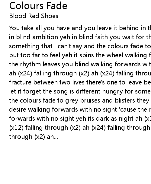 You take all you have and you leave it behind in the hope there's more to find in blind ambition yeh in blind faith you wait for things to change hungry for something that i can't say and the colours fade to grey too close for comfort but too far to feel yeh it spins the wheel walking forwards with no sight 'cause the rhythm leaves you blind walking forwards with no sight yeh its dark as night ah (x24) falling through (x2) ah (x24) falling through (x2) call out the fracture between two lives there's one to leave behind the dream isn't woken so let it forget the song is different hungry for something that i can't say and the colours fade to grey bruises and blisters they follow the ride never turn desire walking forwards with no sight 'cause the rhythm leaves you blind walking forwards with no sight yeh its dark as night ah (x12) falling through (x2) ah (x12) falling through (x2) ah (x24) falling through (x2) ah (x24) falling through (x2) ah... |