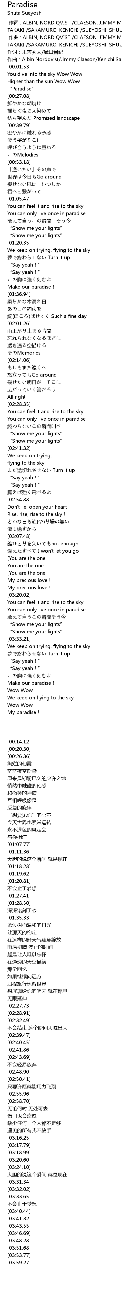 | [00:00.000] | 作词 : ALBIN, NORD QVIST /CLAESON, JIMMY MATHIAS /MIZOGUCHI, TAKAKI /SAKAMURO, KENICHI /SUEYOSHI, SHUUTA |