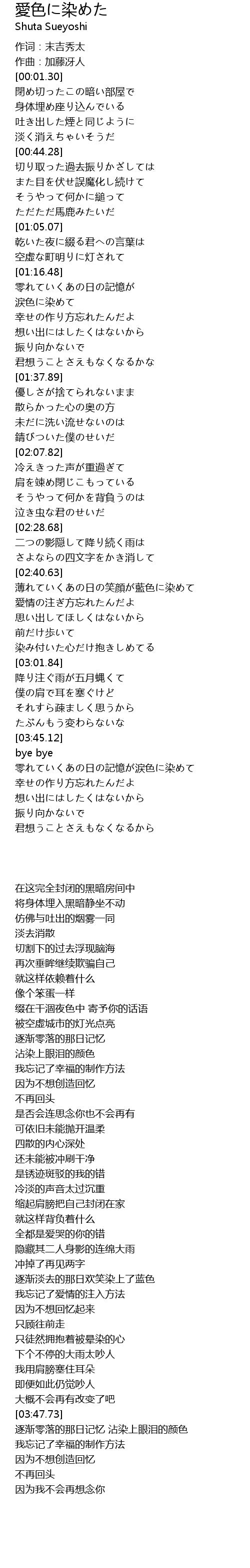 | [02:41.14] | 薄れていくあの日の笑顔が藍色に染めて |