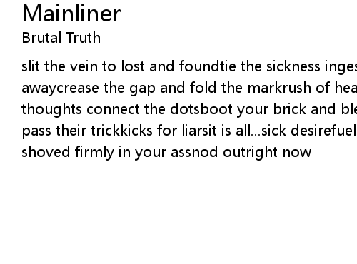 | slit the vein to lost and foundtie the sickness ingested downeyes roll, days awaycrease the gap and fold the markrush of heat, suppress the paingrasping thoughts connect the dotsboot your brick and bless your next fixcattle grazed to pass their trickkicks for liarsit is all...sick desirefuel for fireyour head shoved firmly in your assnod outright now |